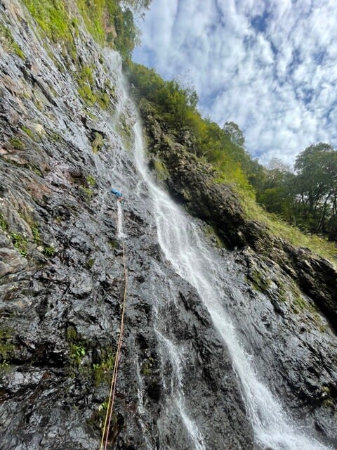 滝の近くはさして苦労もなく進むも、滝に近づくと水流でカムをセットする箇所が判別できない。手探りで